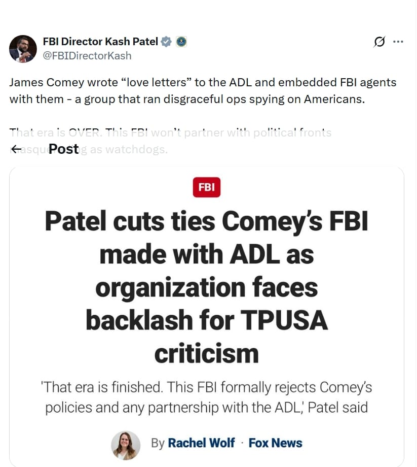 On the surface, this is powerful symbolism. Patel described past cooperation as “activism dressed up as counterterrorism” — a rebuke of the old regime’s methods. He named James Comey’s public praise of ADL work a “love letter,” embedding the narrative that the Bureau is now choosing principle over partnership.